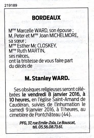 We very are sorry to inform you of Stanley Ward’s recent death. Stanley and his wife Marcelle, were long standing members of the Bordeaux Church until health problems no longer allowed them to be with us on a regular basis. Please keep Marcelle and also Stanley’s family in England in your prayers.